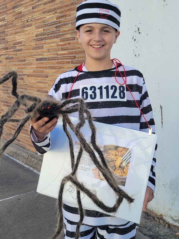 Tracee Parker, escaped jailbird from the historical jail on N. Shelby St., didn't get far with his giant pet spider and sporting a billboard advertising the 1891 Jail Walking Frito Pies for sale. In fact, he was spotted several times around the "Halloween on the Square" activities in Carthage this past Friday evening.